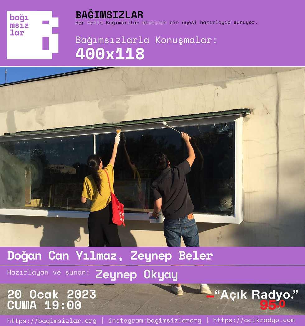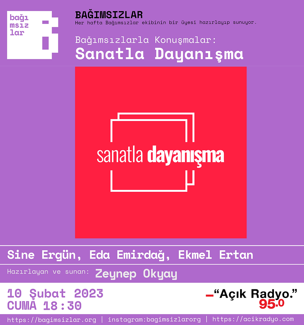Initiated by Ekmel Ertan (amberPlatform), Zeynep Okyay (PASAJ), Ipek Çankaya (halka art project, Art Halicarnassus), Saliha Yavuz (Hayy Open Space, Komunitas), Sarp Keskiner (KARANTINA, Komunitas, Konserve, Teos Arts and Culture Initiative), Daniele Savasta (Yokusun Basi), Ozgul Kilincarslan (Dahili Bellek), Günseli Baki (Sari Denizalti) in 2020; BAGİMSİZLAR [INDEPENDENTS] follows a participatory approach by expanding its operational team with addition of cultural professionals based in various cities.